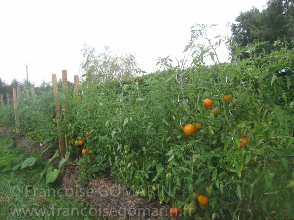 La culture sur bottes de paille, ça marche plutôt bien. Voilà le résultat avec des tomates et des citrouilles mais j’ai fait pousser des physalis, des courgettes, des pommes de terre, des calebasses de l’Île de La Réunion, des aubergines… J’étais très enthousiaste dans un premier temps avec ma paille mais si ce mode de culture est bien adapté à de petites surfaces, dès qu’il s’agit de vouloir voir plus grand, la manutention est lourde.