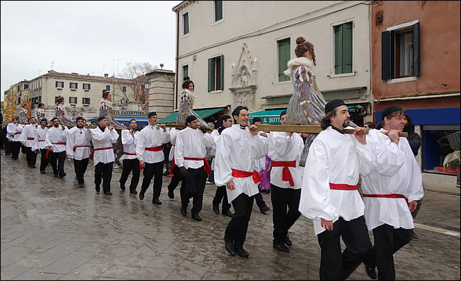 Comme autrefois, les Maries sont portées par de solides jeunes vénitiens, de l’église de San Pietro di Castello jusqu’à à la place Saint Marc.