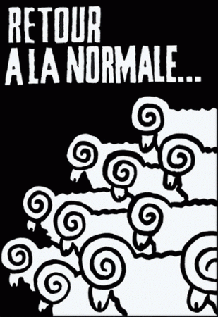 • Le groupe de mots «retour à la normale» rappelle le discours de l’autorité, relayé par les médias ; il peut être lu de manière ironique comme le triste constat d’une soumission consensuelle. En mai 1968, le dessin des moutons accentue la notion de soumission au pouvoir (des moutons ou des veaux destinés à l’abattoir, en groupes.