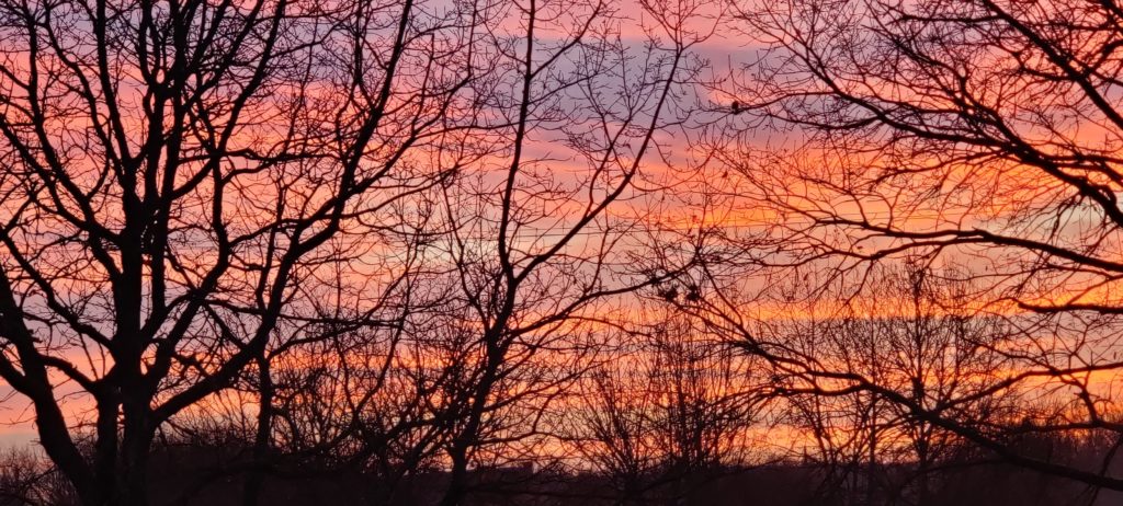 Joli matin de Mardi-Gras ! Comment trouver un matin joli ? Simplement en ouvrant sa fenêtre et en regardant les couleurs du ciel. Ce matin de Mardi-Gras, le ciel s’était joliment maquillé de rouge, rose et orangé.